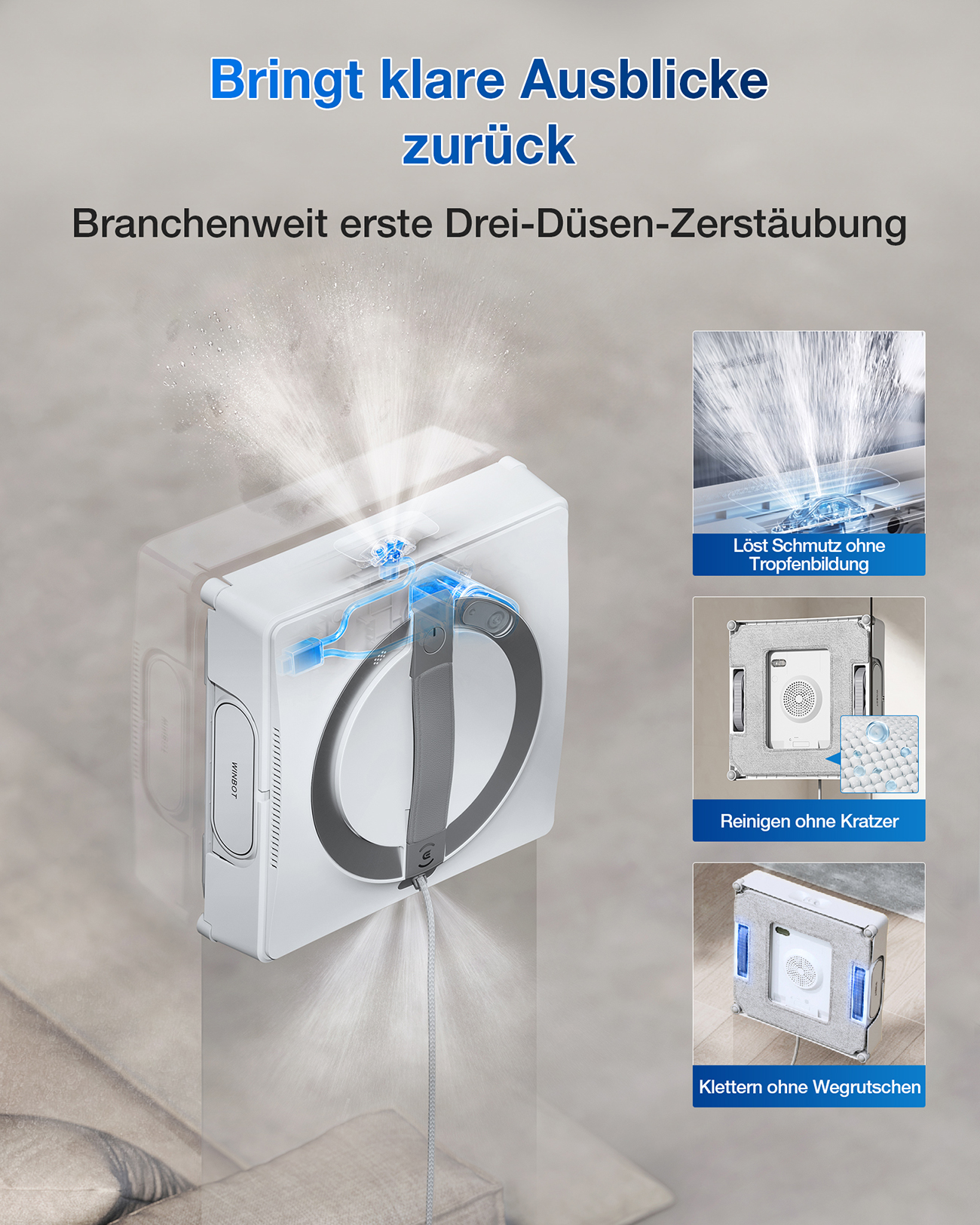 Der Winbot W2 Pro spricht Ihre Sinne an und schafft eine Atmosphäre der Leichtigkeit und Sauberkeit in Ihrem Zuhause oder Büro. Das Gefühl, durch blitzblanke Fenster den Ausblick ungestört zu genießen und gleichzeitig die Gewissheit zu haben, dass ein ausgeklügeltes Hightech-System mit intelligenter Routenplanung und automatischer Sprühfunktion für makellose Ergebnisse sorgt, ist einfach unvergleichlich. Es ist mehr als nur ein Reinigungsgerät – es ist Ihr persönlicher Helfer für mehr Lebensqualität.