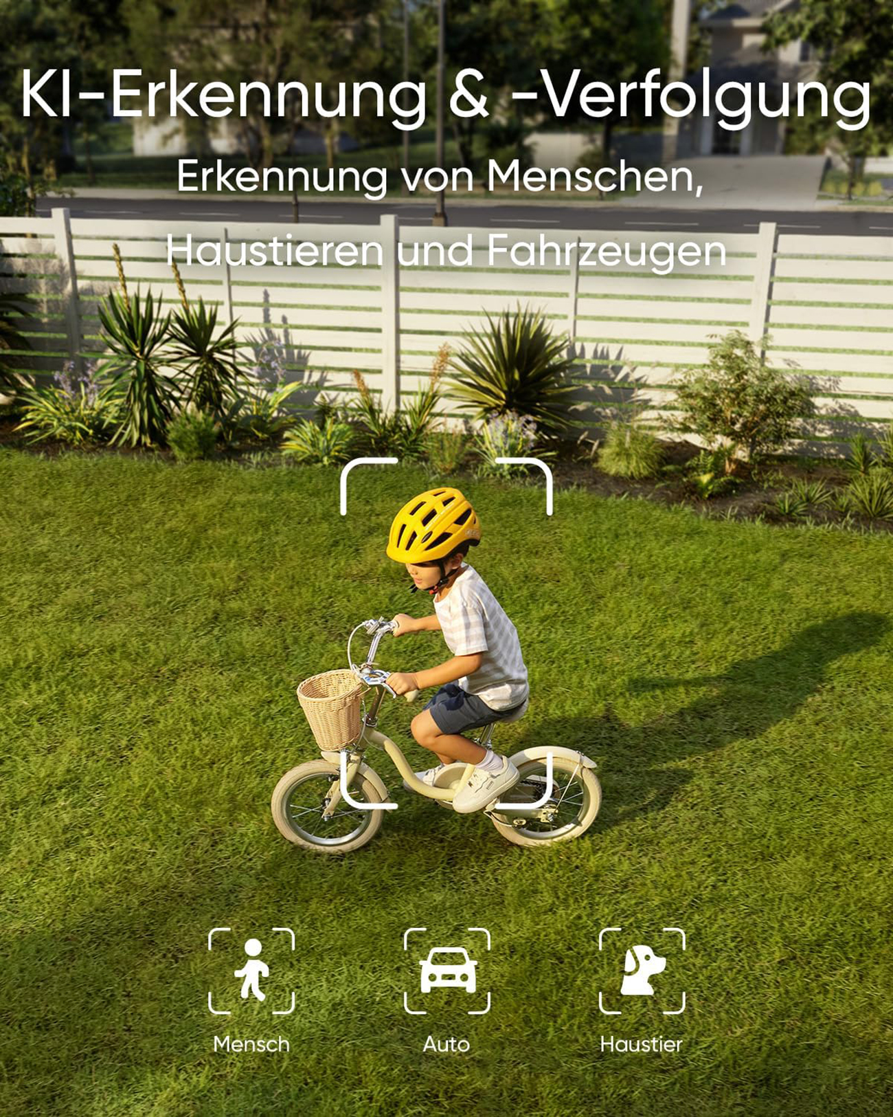 Dank der integrierten künstlichen Intelligenz (KI) erkennt die Kamera zuverlässig Personen, Fahrzeuge und andere Bewegungen. Die Kamera kann diese Objekte automatisch verfolgen, was eine präzise Überwachung ermöglicht und Fehlalarme reduziert. So werden Sie nur bei wirklich relevanten Ereignissen benachrichtigt.