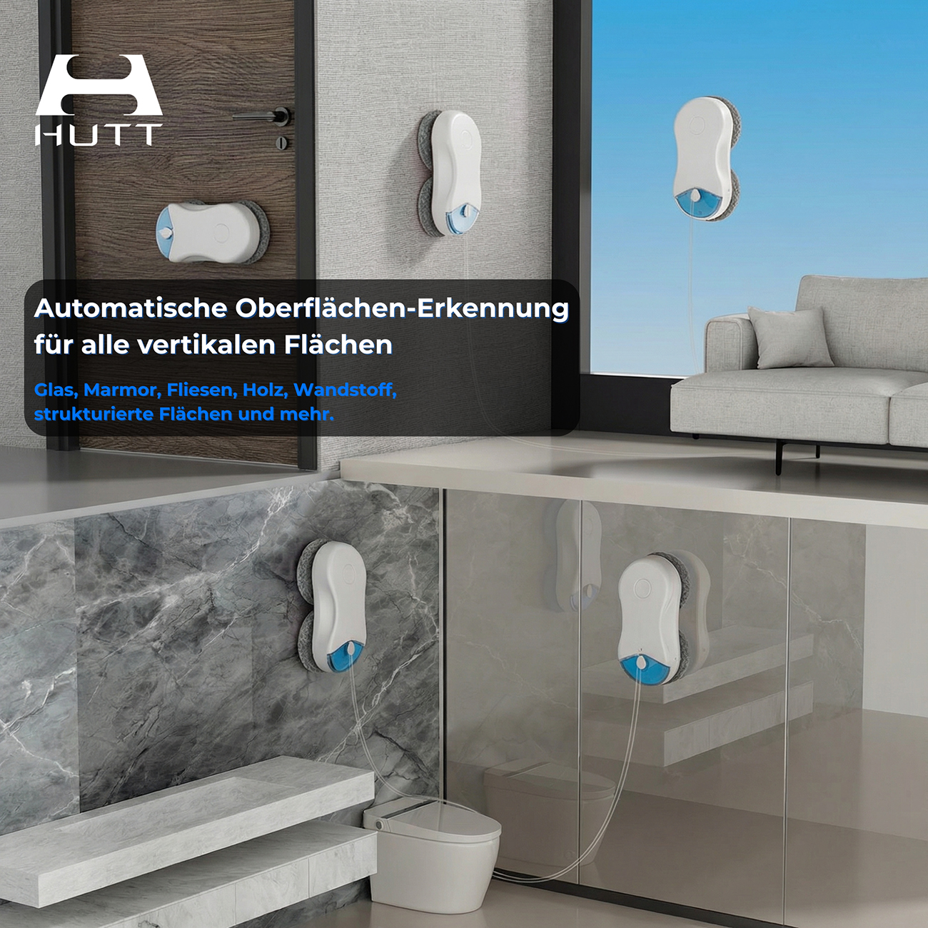 Ob im Privathaushalt oder in gewerblichen Gebäuden – der Hutt DDC55PRO überzeugt überall dort, wo Fenster und Rahmen bis zum letzten Millimeter gereinigt werden sollen. Nutzen Sie ihn für große Glasfronten im Wohnzimmer, gläserne Balkontüren oder auch für Bürofenster mit komplizierten Rahmenstrukturen. Selbst mehrteilige Fensterfronten meistert er dank seiner präzisen Navigation spielend leicht. So sparen Sie wertvolle Zeit und genießen gleichzeitig ein hygienisch reines Raumklima.
