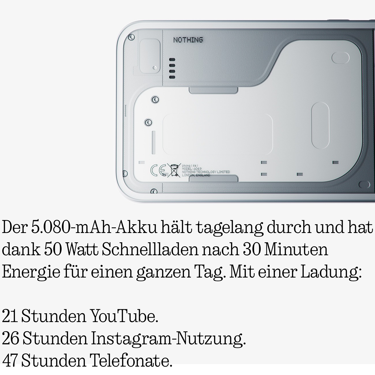 Nachhaltigkeit ist bei Nothing mehr als ein Versprechen: Das Phone (4a) besteht zu einem großen Teil aus recycelten Materialien, wird mit 100 % erneuerbarer Energie gefertigt und kommt in plastikfreier Verpackung. So genießt du innovative Technik mit gutem Gewissen.