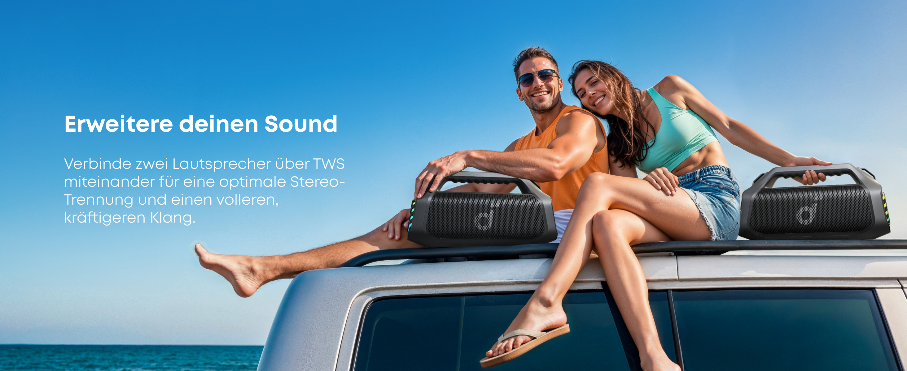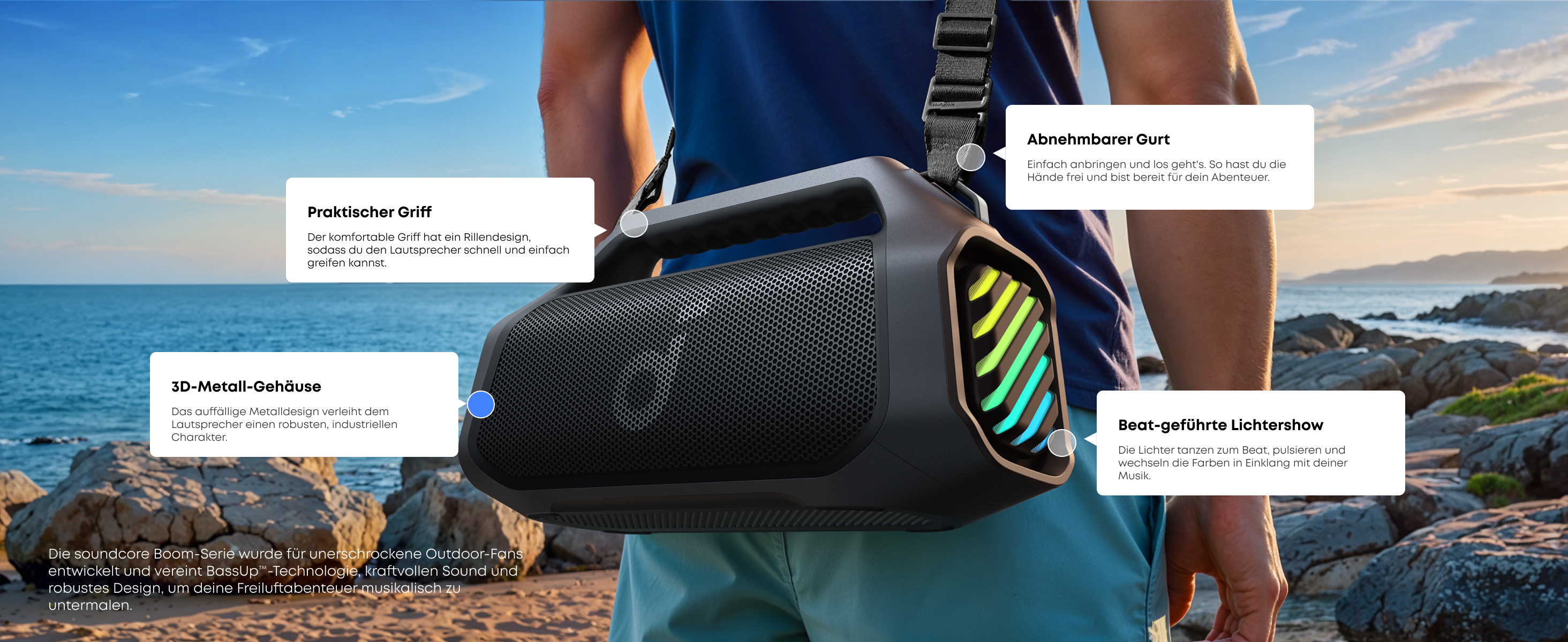 Ob du am Strand liegst, im Garten grillst oder mit Freunden unterwegs bist – der Soundcore Boom 2 Pro begleitet dich zuverlässig und sorgt für den perfekten Soundtrack zu deinem Leben. Verbinde ihn kinderleicht per Bluetooth mit deinem Smartphone oder Tablet und starte deine Lieblingsplaylist in sekundenschnelle. Auch für Outdoor-Sportarten oder entspannte Yoga-Sessions ist er dank seiner Robustheit und langen Akkulaufzeit ideal geeignet.